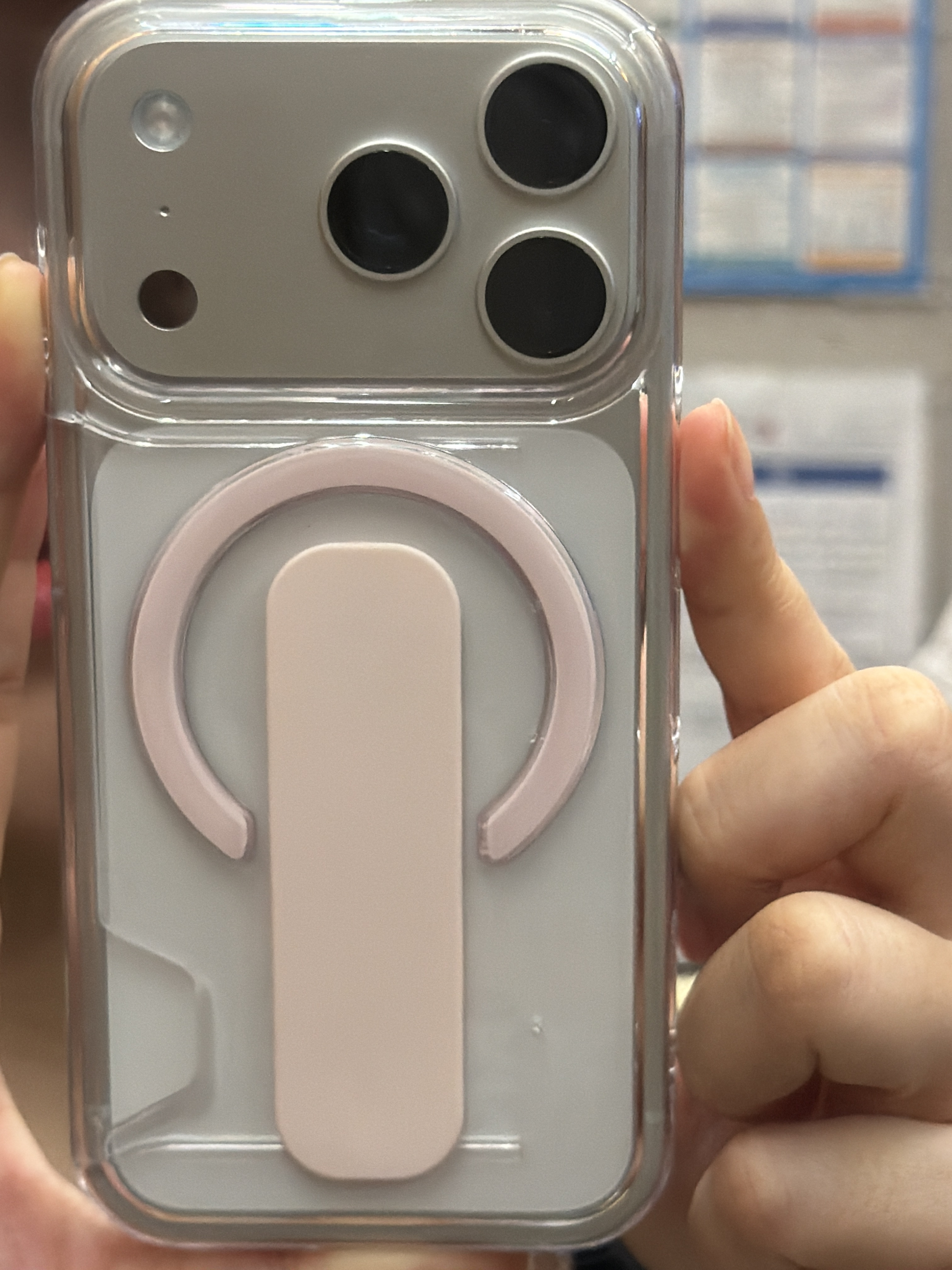 근데 케이스가 너무 안이뻐서 저는 맥세이프 투명 케이스를 샀는데,, 저처럼 잘 떨어트리는 사람은 이렇게 손가락 거는게 좋을 수도 있어요